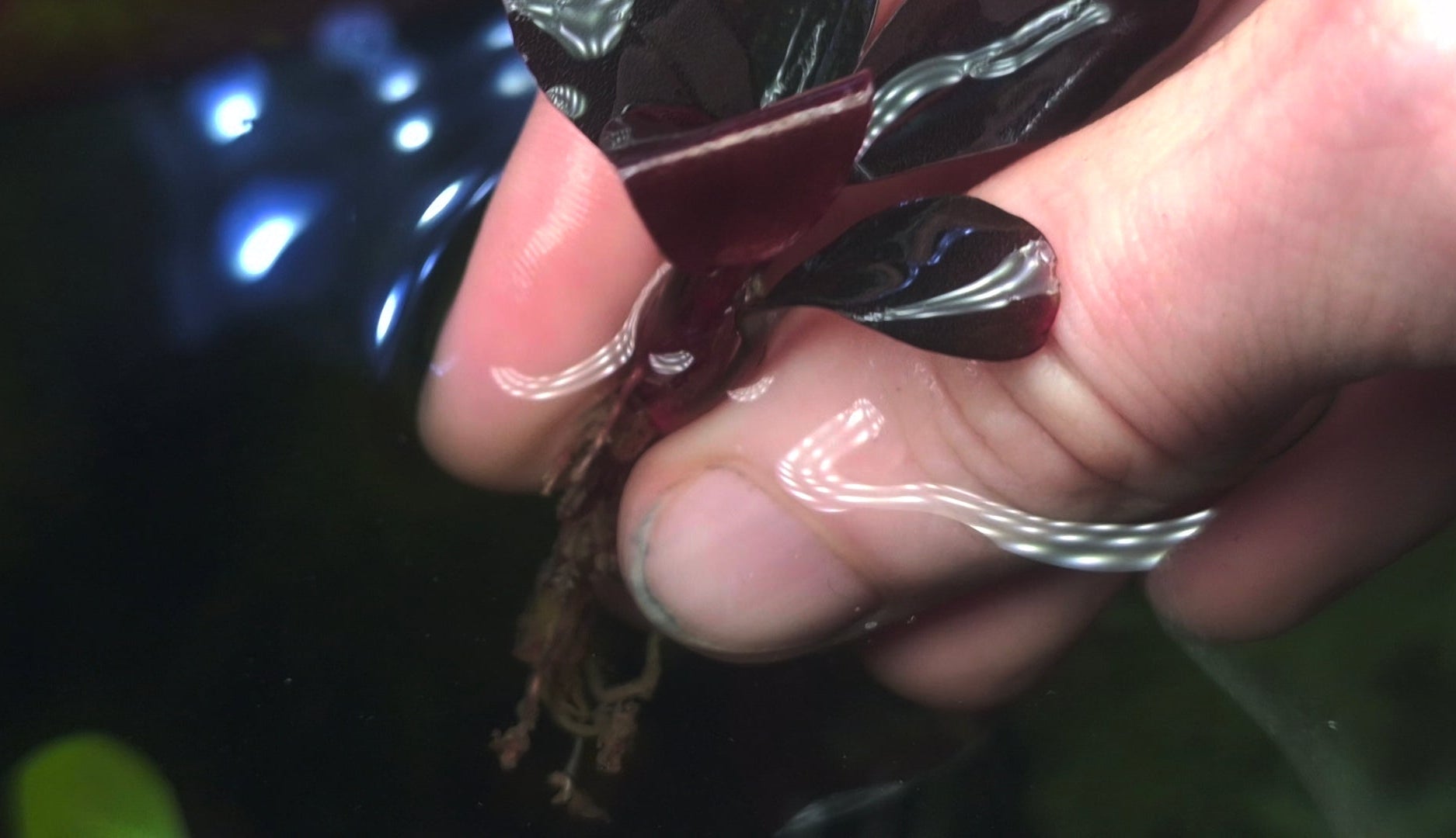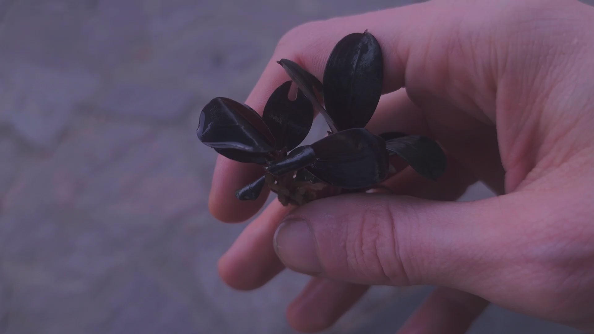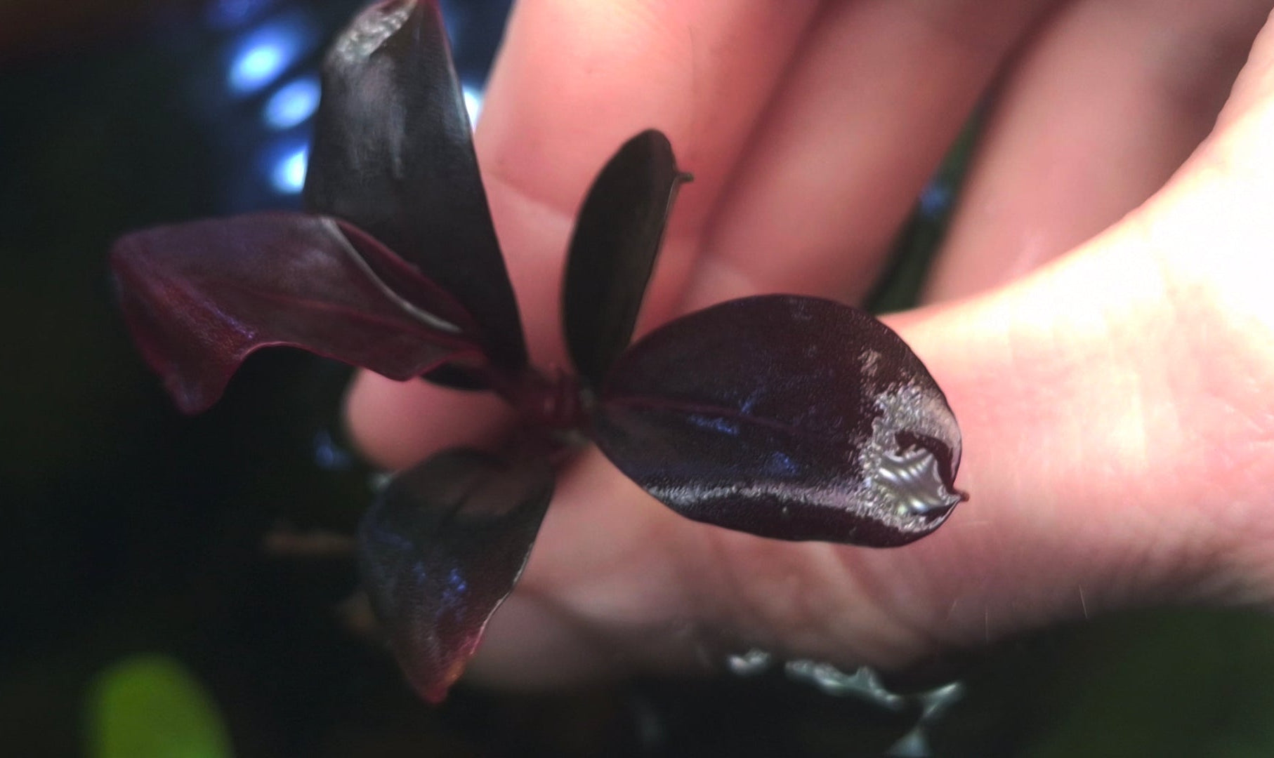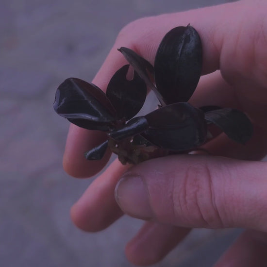 Die Bucephalandra “Blue Moon” ist eine seltene, elegante Pflanze mit dicken, glänzenden Blättern, die von dunkelgrün bis metallisch blau reichen und unter starkem Licht violette Schimmer zeigen. Die ausgeprägte Mittelrippe und leicht gewellte Blattränder erzeugen einen dreidimensionalen Effekt. Der Rhizom entwickelt kompakte Knospen mit engstehenden Blättern, was selbst in kleinen Aquarien ein geordnetes Wachstum garantiert.