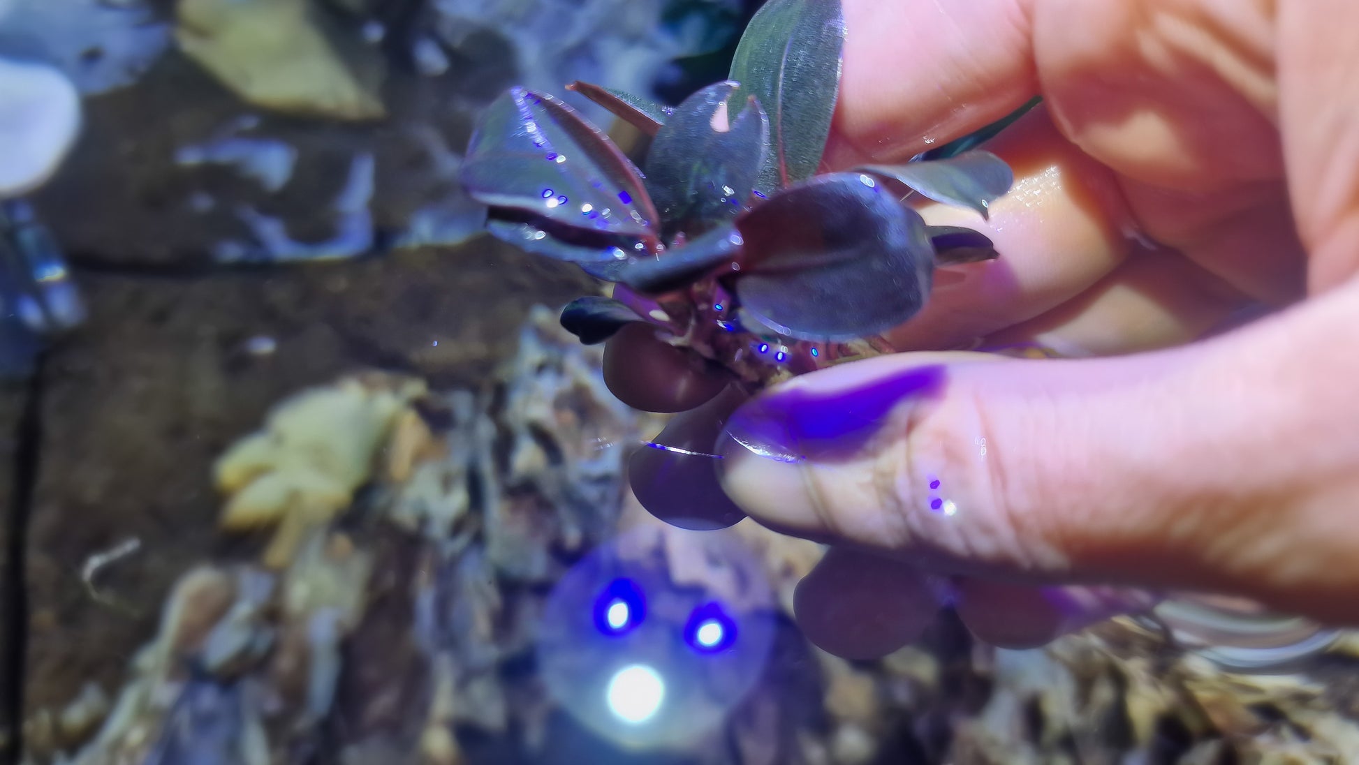 Seltene Borneo-Art mit dicken, samtigen Blättern, die unter kühlem Licht in metallischem Blau und Violett schimmern. Langsames, gleichmäßiges Wachstum und kompakter Wuchs – perfekt für anspruchsvolle Aquascapes.
