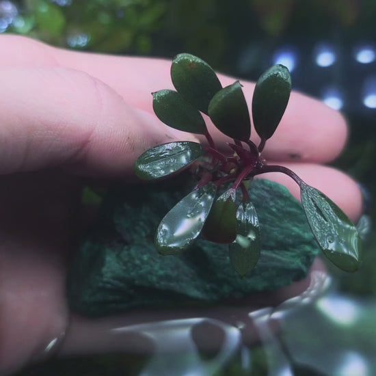 This splendid variety of Bucephalandra Penelope is distinguished by its rounded, intense dark green leaves and characteristic bright red stems that create an elegant chromatic contrast. Originating from the rainforests of Borneo, it is a slow-growing epiphytic plant, ideal for anchoring onto wood or rocks; it is essential never to bury the rhizome to prevent it from rotting. For maintenance, it is advisable to remove older and damaged leaves, while for propagation it is sufficient to cut the rhizome into healthy portions to reposition. The ideal values for its cultivation are Temperature: 22–27 °C, pH: 6.0–6.5, KH: 2, GH: 7–8. Although it is a hardy plant, I strongly recommend the use of CO₂ and good lighting to enhance its colours and health, combined with targeted fertilization using 2HR Aquarist APT e/Estimative Index. I offer plants that are sterilized before being shipped so as not to send algae or anything else.